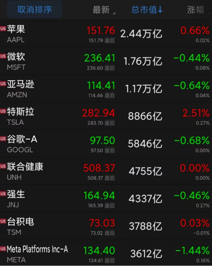 盘面上看,大型科技股涨跌不一。特斯拉涨2.51%,英伟达涨1.51%,苹果涨0.66%,台积电涨0.03%。脸书母公司Meta跌1.44%,亚马逊、微软、谷歌录得小幅下跌。