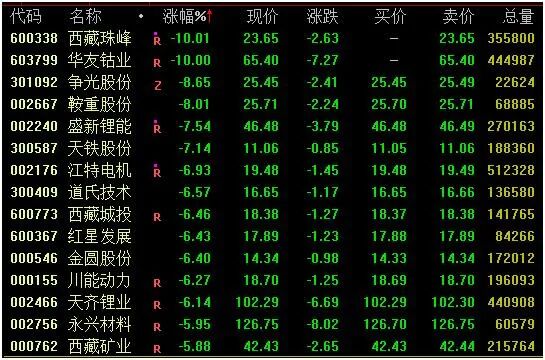 锂矿概念方面,截至收盘,西藏珠峰、华友钴业跌停,盛新锂能跌超7%,天齐锂业、永兴材料跌约6%,赣锋锂业跌约5%;光伏概念方面,宝馨科技、楚江新材、金晶科技跌停,金辰股份逼近跌停,通威股份跌近5%。