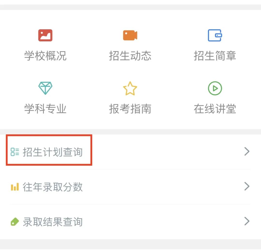 招生计划查询包括招生类型、招生院系及专业名称、学制、选考科目要求、计划数与学费等。