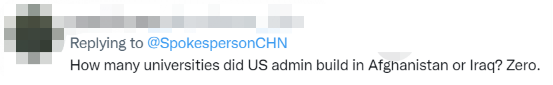 还有人以自问自答讽刺“某国”:“美国政府在阿富汗或伊拉克建造了多少所大学?答案是零。”
