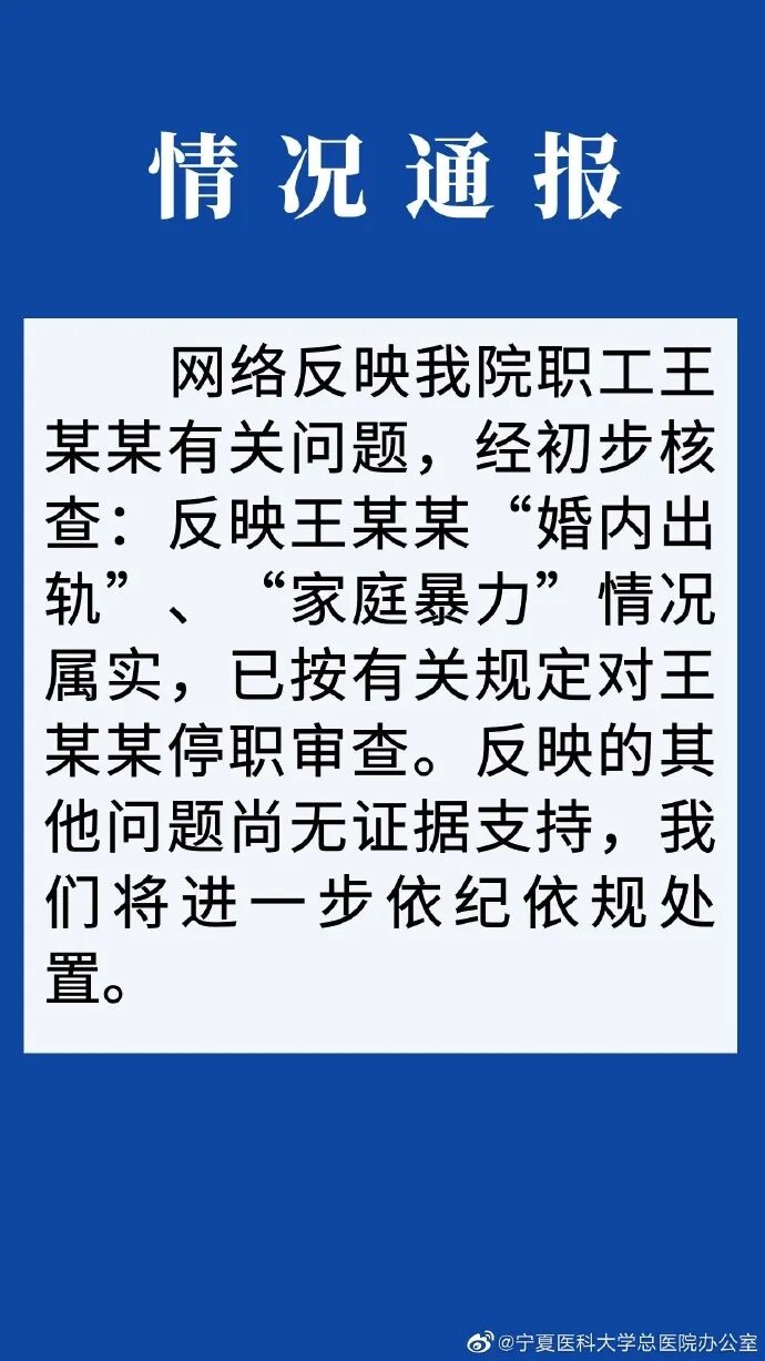 网络反映我院职工王某某有关问题,经初步核查:反映王某某“婚内出轨”、“家庭暴力”情况属实,已按有关规定对王某某停职审查。反映的其他问题尚无证据支持,我们将进一步依纪依规处置。![]()