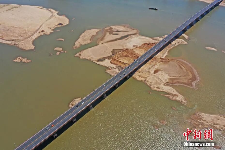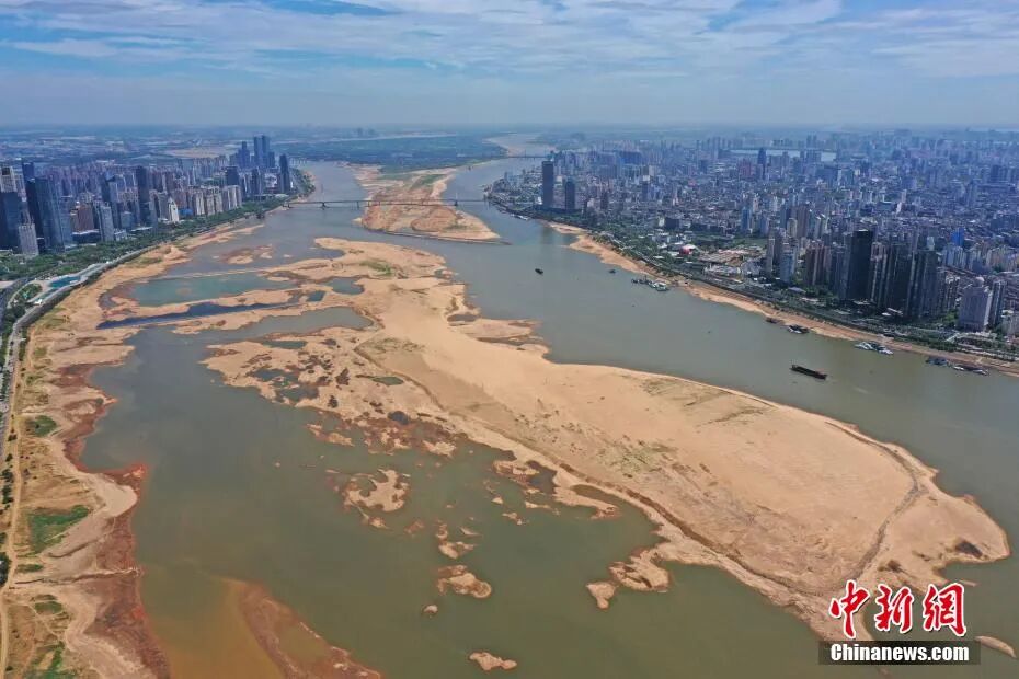 处暑节气过后,高温晴热依旧。8月26日,江西南昌,航拍水位持续走低的“江西第一大河流”赣江。在赣江南昌段水域,大片河床显露,部分堤岸河床已经干涸开裂。刘占昆 摄