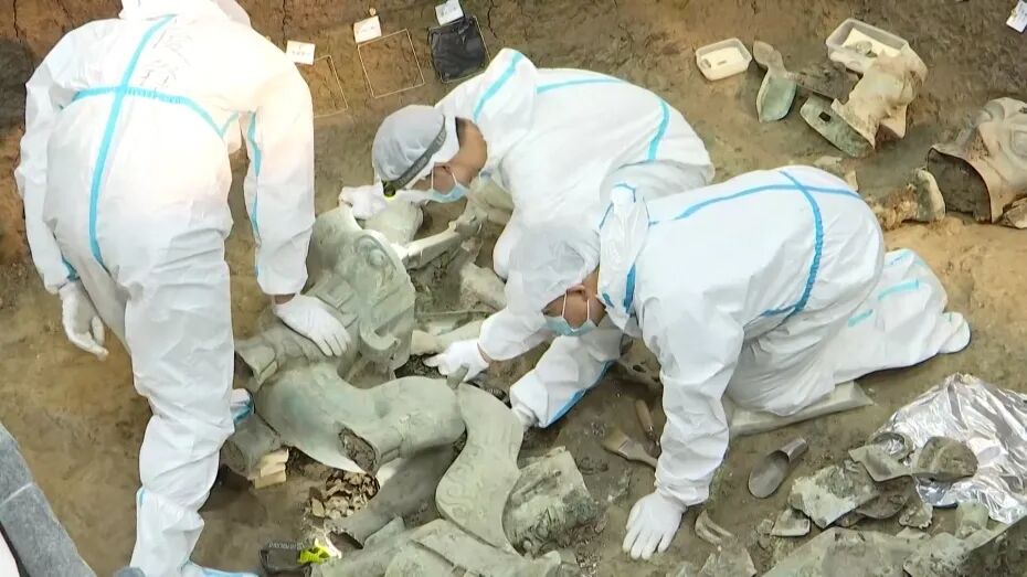 8月26日消息,近日,四川广汉三星堆遗址8号祭祀坑成功提取出一件大型立人神兽,这件青铜大神兽1米多长,重量近300斤。是截至目前三星堆出土众多动物造型青铜器中最大的一件。(视频截图)图片来源:视觉中国