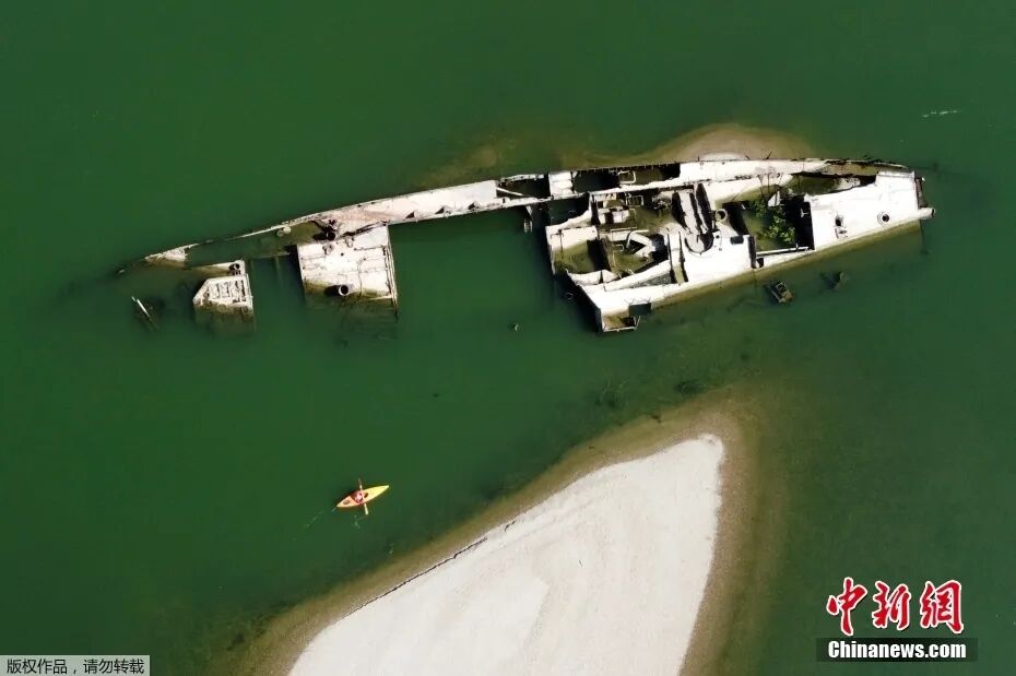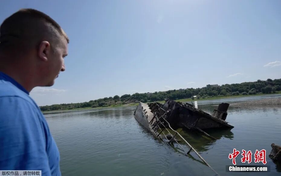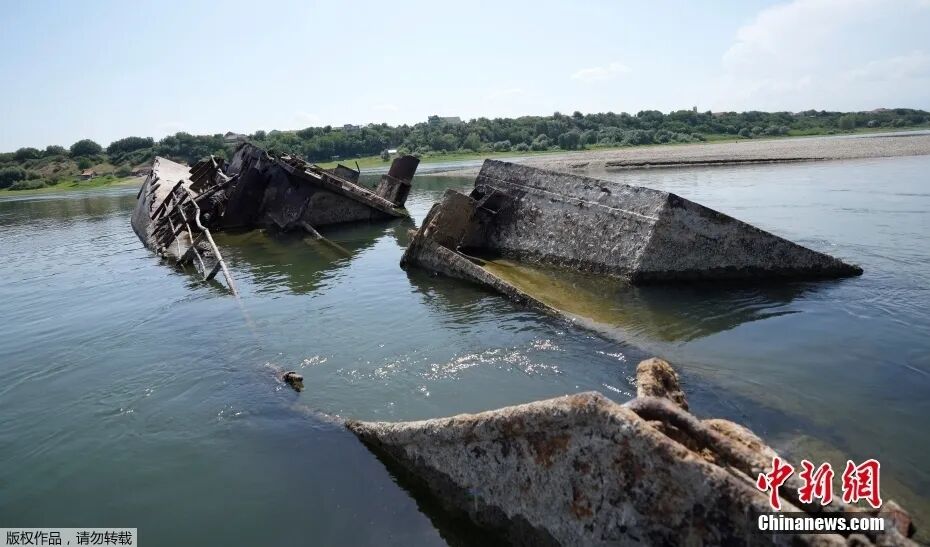 近期,持续的高温干旱天气导致欧洲许多湖泊和众多河流水位下降,在塞尔维亚东部普拉霍沃附近的多瑙河河段上,数十艘二战时期战舰残骸裸露出来。这些战舰被证实属于纳粹德国黑海舰队,很多战舰上还遗留有弹药和炸药。图为当地时间8月26日,露出水面的二战军舰残骸。