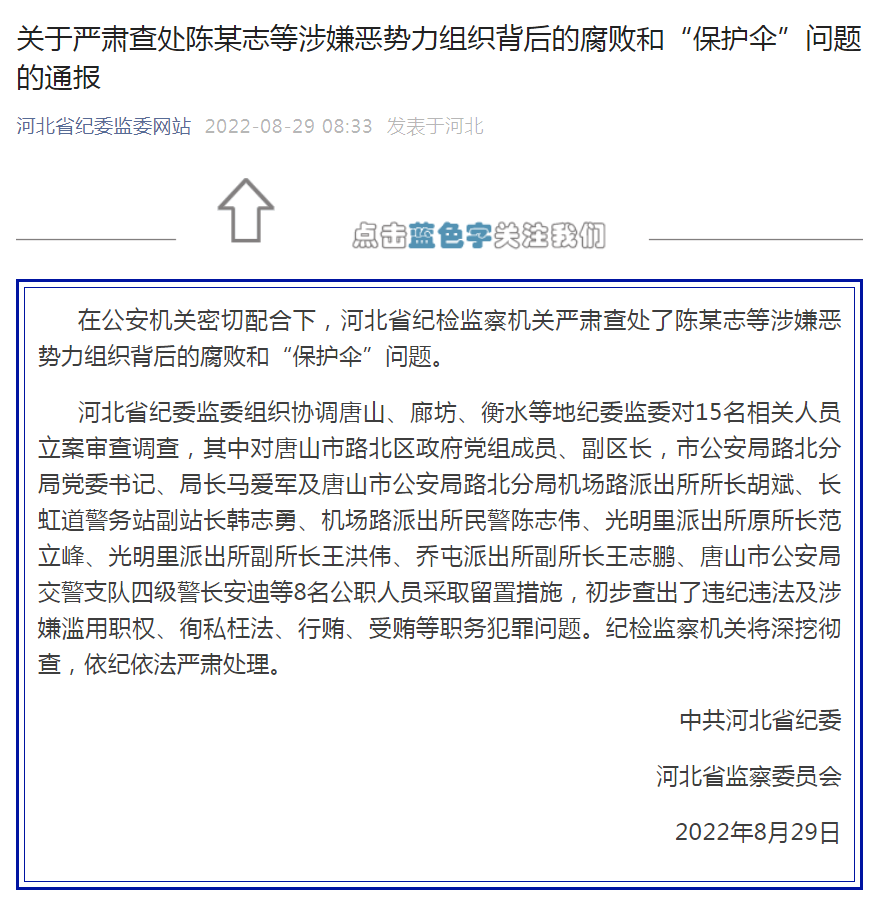 河北省纪委监委网站29日发布《关于严肃查处陈某志等涉嫌恶势力组织背后的腐败和“保护伞”问题的通报》。