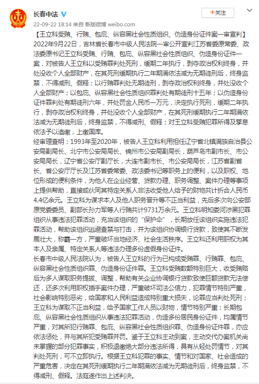 2022年9月22日,吉林省长春市中级人民法院一审公开宣判江苏省委原常委、政法委原书记王立科受贿、行贿、包庇、纵容黑社会性质组织、伪造身份证件一案,对被告人王立科以受贿罪判处死刑,缓期二年执行,剥夺政治权利终身,并处没收个人全部财产,在其死刑缓期执行二年期满依法减为无期徒刑后,终身监禁,不得减刑、假释;以行贿罪判处无期徒刑,剥夺政治权利终身,并处没收个人全部财产;以包庇、纵容黑社会性质组织罪判处有期徒刑十五年;以伪造身份证件罪判处有期徒刑六年,并处罚金人民币一万元,决定执行死刑,缓期二年执行,剥夺政治权利终身,并处没收个人全部财产,在其死刑缓期执行二年期满依法减为无期徒刑后,终身监禁,不得减刑、假释;对王立科受贿犯罪所得及孳息依法予以追缴,上缴国库。经审理查明:1993年至2020年,被告人王立科利用担任辽宁省北镇满族自治县公安局副局长、北宁市公安局局长、锦州市公安局副局长,葫芦岛市副市长、市公安局局长,辽宁省公安厅副厅长,大连市副市长、市公安局局长,江苏省副省长、省公安厅厅长及江苏省委常委、政法委书记等职务上的便利,以及职权、地位形成的便利条件,为他人在企业经营、贷款办理、职务调整、案件办理等事项上提供帮助,直接或伙同其特定关系人非法收受他人给予的财物共计折合人民币4.4亿余元。王立科为谋求本人及他人职务晋升等不正当利益,先后多次向公安部原党委委员、副部长孙力军等人行贿共计9731万余元。王立科明知娄河涉黑犯罪组织从事违法犯罪活动,充当该组织的“保护伞”,长期放任该组织实施违法犯罪活动,帮助该组织逃避查禁与打击,并为该组织协调银行贷款,致使其不断发展壮大,称霸一方,严重破坏当地经济、社会生活秩序。王立科还利用职权为其本人及亲属、特定关系人等违法办理多份虚假身份证件。长春市中级人民法院认为,被告人王立科的行为已构成受贿罪、行贿罪、包庇、纵容黑社会性质组织罪、伪造身份证件罪。王立科受贿数额特别巨大,收受贿赂后为多人谋取职务提拔、调整,帮助有关企业协调银行贷款致使巨额贷款无法偿还,还多次利用职权插手案件办理,严重破坏司法公信力,犯罪情节特别严重,社会影响特别恶劣,给国家和人民利益造成特别重大损失,论罪应当判处死刑;王立科为谋取不正当利益,给予国家工作人员以财物,情节特别严重;长期包庇、纵容黑社会性质组织从事违法犯罪活动,伪造多份居民身份证件,均属情节严重,对其所犯行贿罪、包庇、纵容黑社会性质组织罪、伪造身份证件罪,亦应依法惩处,并与其所犯受贿罪并罚。鉴于王立科主动到案,主动交代办案机关尚未掌握的部分犯罪事实,积极退缴绝大部分违法所得,具有从轻处罚情节,对其判处死刑,可不立即执行。根据王立科犯罪的事实、情节和对国家、社会造成的严重危害,决定在其死刑缓期执行二年期满依法减为无期徒刑后,终身监禁,不得减刑、假释。法庭遂作出上述判决。