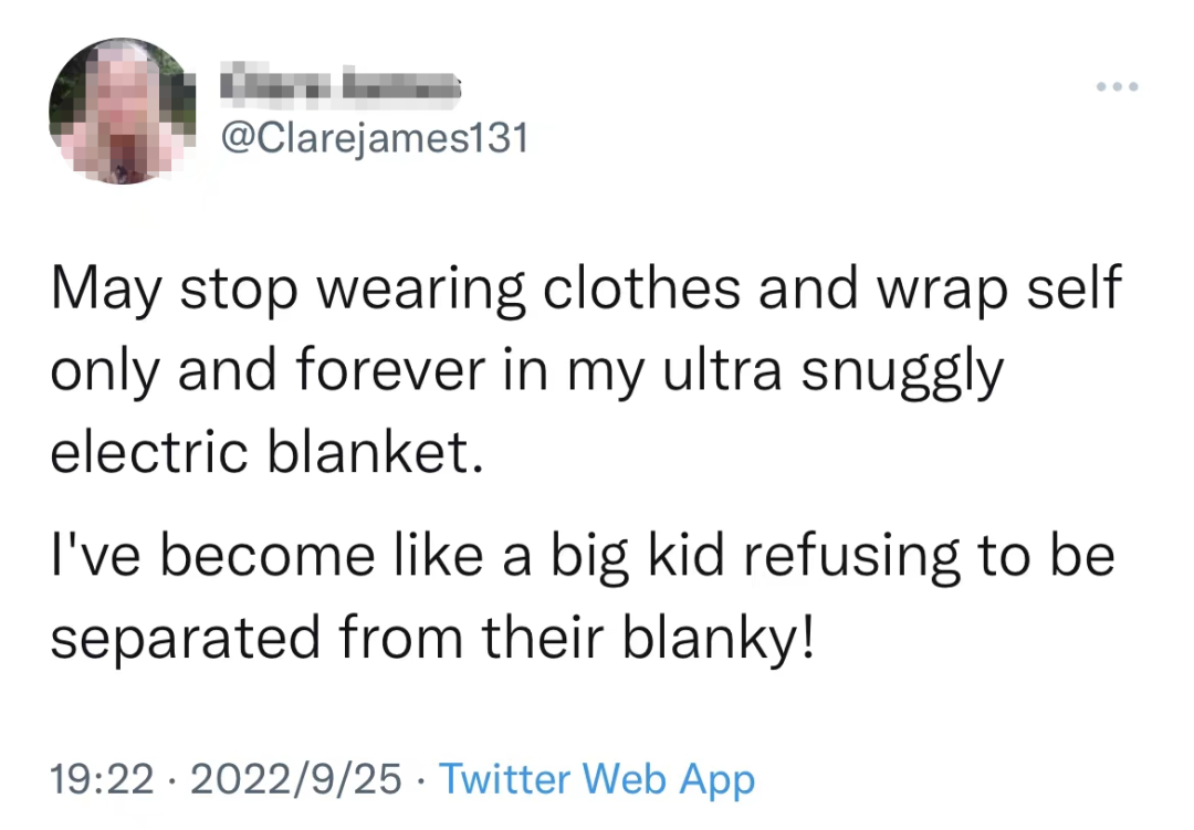 “如果你能买得起一个电热毯,做个窝,搞舒服一点,就待在那里吧。用电热毯取暖比把整个房子都弄热要便宜得多。去年1月我生日的时候,我收到了我的第一个电热毯,从此它改变了我的生活。”