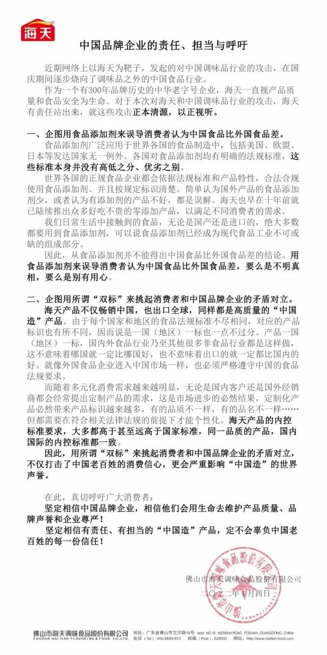 在声明中,海天味业表示,食品添加剂广泛应用于世界各国的食品制造中,各国对食品添加剂均有明确的法规标准,这些标准本身没有高低之分、优劣之别。世界各国的正规食品企业都会依据法规标准和产品特性,合法合规使用食品添加剂,并且按规定标识清楚。食品添加剂已成为现代食品工业不可或缺的组成部分,从食品添加剂并不能得出中国食品比外国食品差的结论。“用食品添加剂来误导消费者认为中国食品比外国食品差,要么是不明真相,要么是别有用心”。