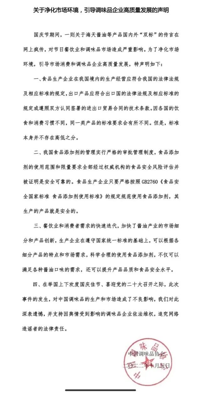 值得注意的是,中国调味品协会10月5日也针对海天味业的相关争议发布声明。