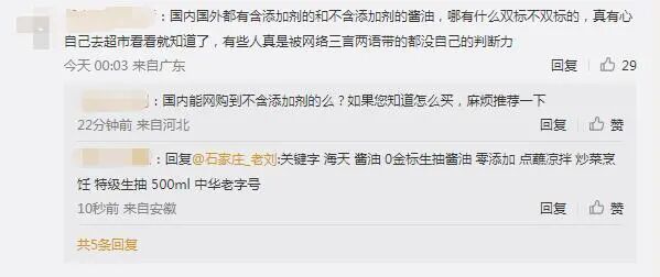 中新经纬注意到,对海天味业的最新声明,有网友表示支持,称国内国外都有含添加剂的和不含添加剂的酱油,没有什么双标不双标的;不过也有很多网友认为海天味业的公关以及文案实在太差,在声明中科普就行,没必要用中国品牌责任感去绑架。