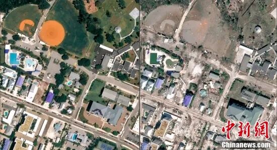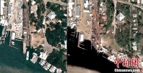 当地时间10月4日,卫星图像显示飓风“伊恩”登陆美国佛罗里达州迈尔斯堡海滩前后的景象(拼接图)。据美国媒体报道,截至美国东部时间10月4日21时35分,美国已有至少109人因飓风“伊恩”丧生。经济学家预测,这场风暴可能给美国造成数百亿美元损失。