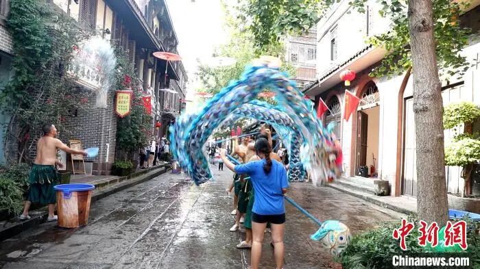 人在水中舞,龙在水中飞。10月5日,有着千年历史的重庆铜梁安居古城上演水云龙表演,龙腾舞跃为节日助兴的同时,也祈求风调雨顺和国泰民安。水云龙是国家级非物质文化遗产项目铜梁龙舞的一种,分为请龙、迎龙、点睛、敬水、接福和回宫。