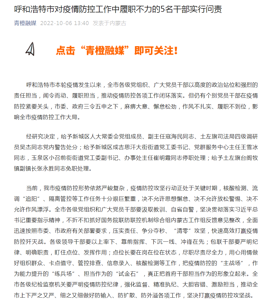 据“青橙融媒”微信公众号10月6日消息,内蒙古呼和浩特市本轮疫情发生以来,全市各级党组织、广大党员干部以高度的政治站位和强烈的责任担当,闻令而动、履职担当,推动疫情防控各项工作闭环落实。但仍有个别党员干部在疫情防控紧要关头,市委、政府三令五申之下,麻痹大意、懈怠松劲,作风不扎实、履职不到位,影响全市疫情防控工作大局。