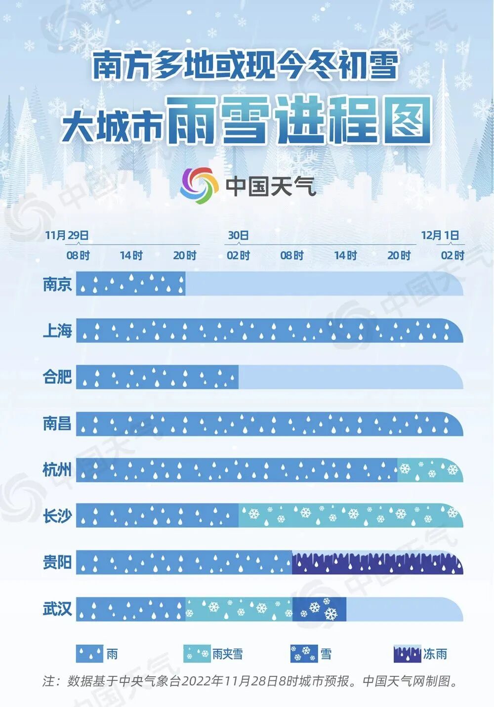 29日夜间开始,南方部分地区将会出现雨雪转换,多地或迎今冬初雪,部分地区还将有冻雨。中国天气网推出大城市雨雪进程图,看看你那里何时飘雪。