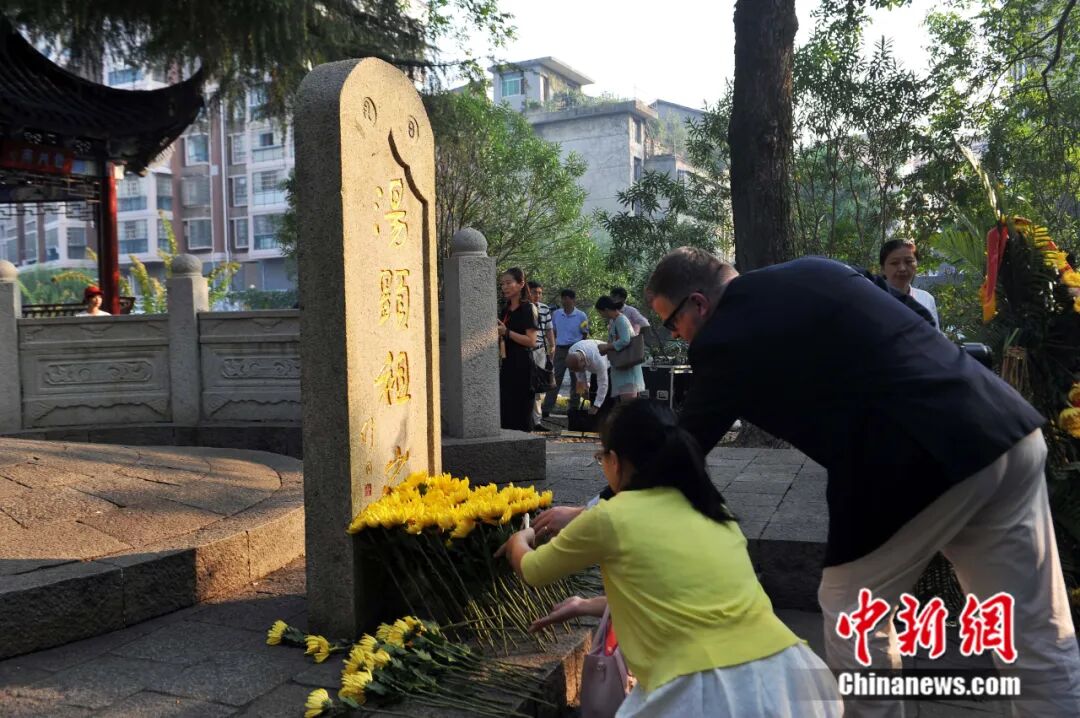2016年, “汤显祖故里”江西抚州市举行拜谒汤显祖墓活动。海内外汤学专家学者、英国莎士比亚故乡和西班牙塞万提斯故乡的外宾代表等共计300余人,拜谒汤显祖墓并敬献了鲜花。刘占昆 摄