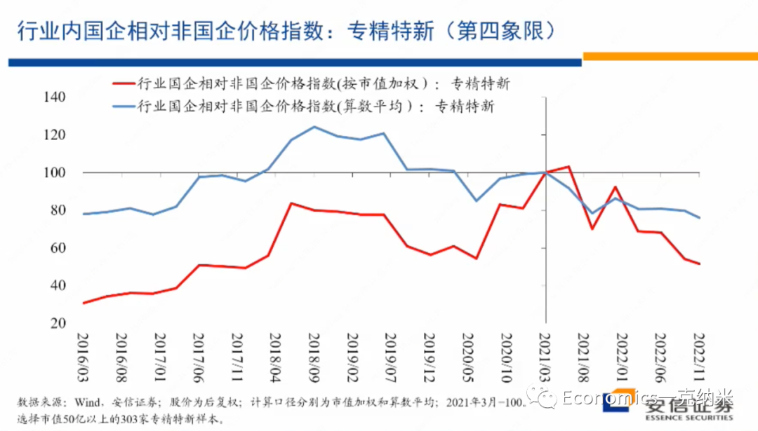 首先的话就是专精特新的相对的价格指数,总体上来讲的话,在2021年以来,2020年底以来,相对于万德全A的它有一个不断扩大的相对的收益。而且在专精特性内部,国企相对非国企的优势,