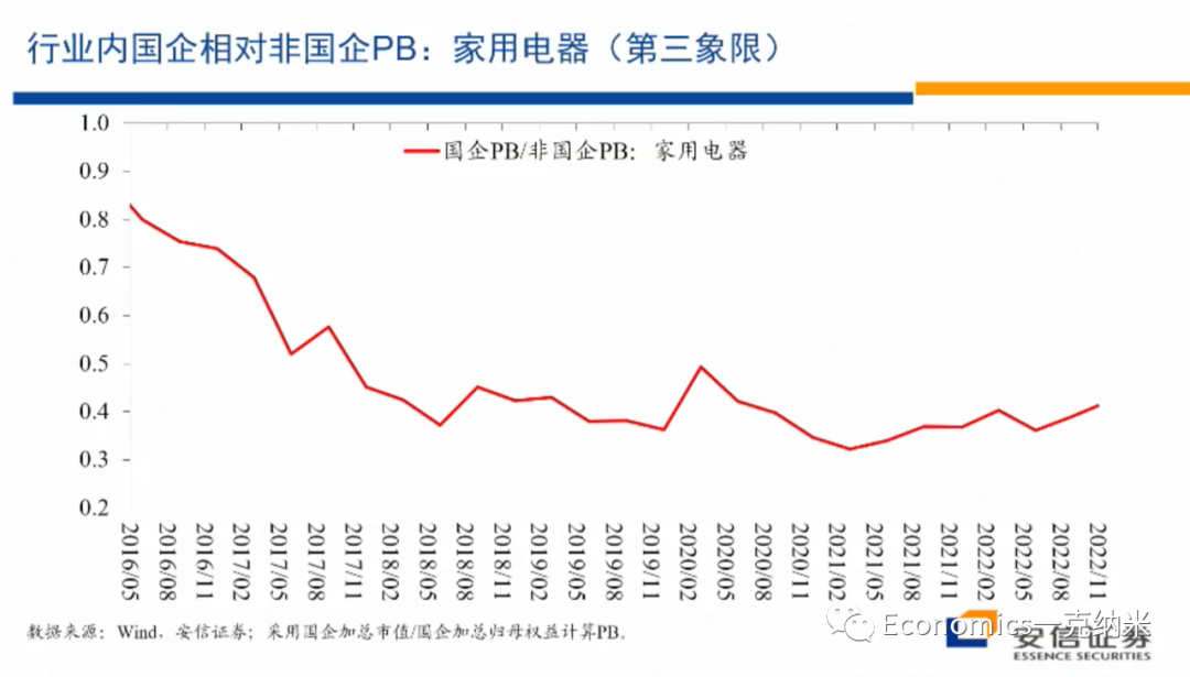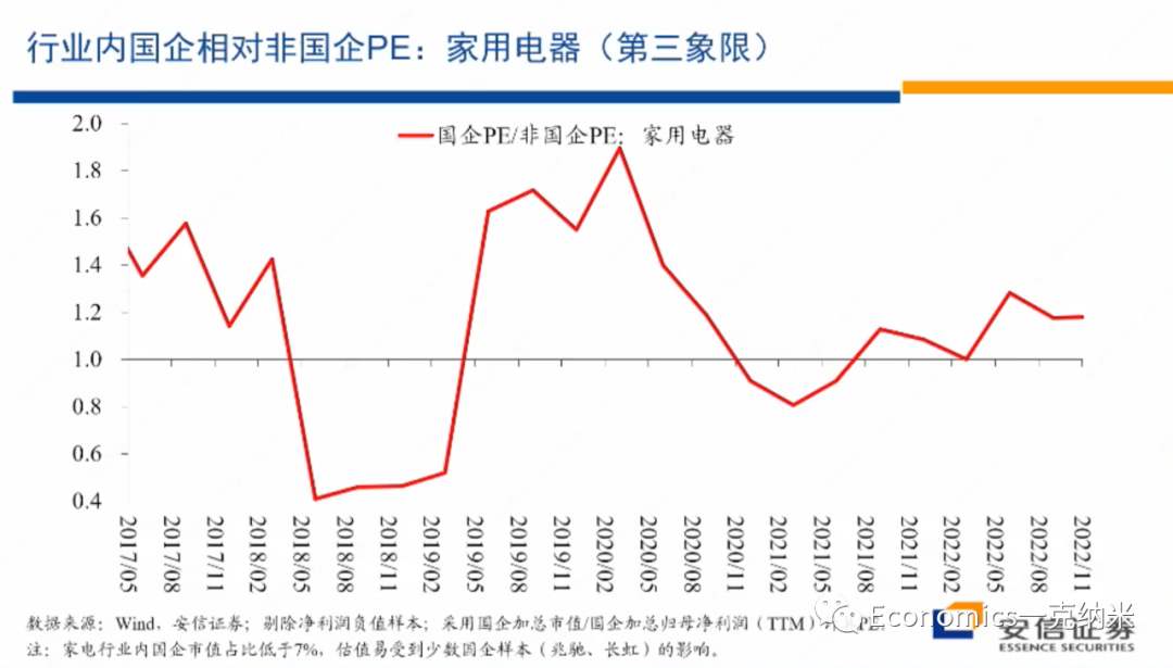 但是我们看这个行业内部国企相对非国企的估值层面的变化,总体上来看,尽管在国防军工领域,我们看到了国企的估值优势相对在扩大,但是在家用电器这个领域,国企相对非国企的相对估值体系总体上是相对比较稳定的。