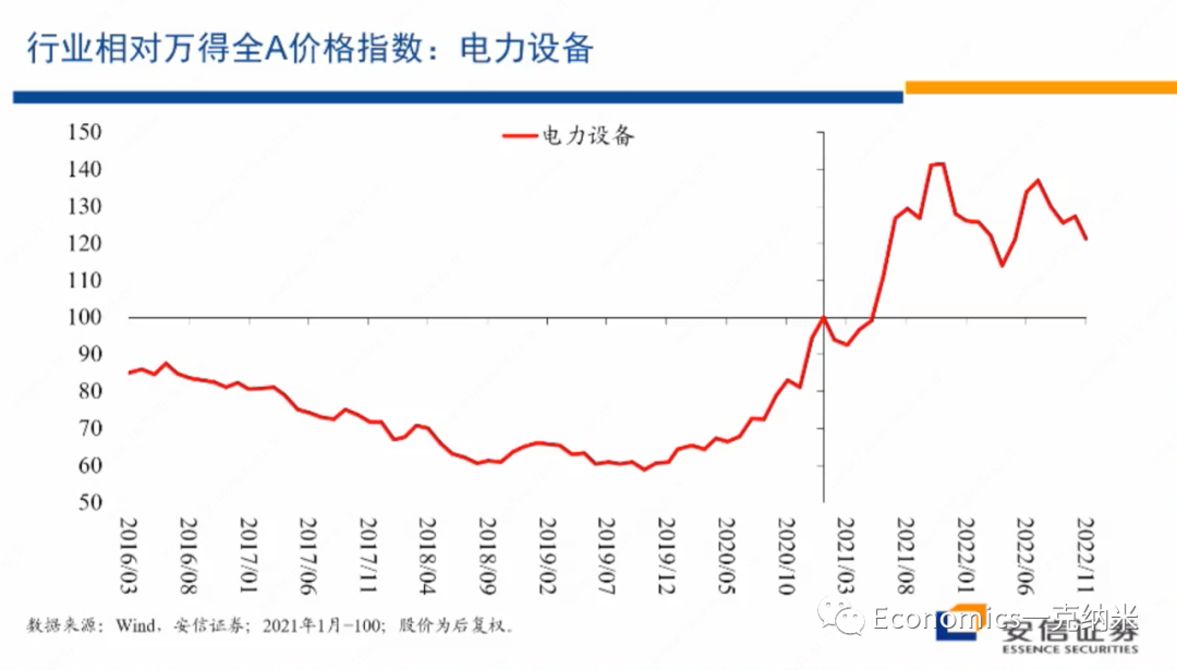 在这个意义上来讲,电力设备涉及到重要的基础设施,从而的话存在安全关切。但是到底如何看待电力设备这个行业,大家可以见仁见智,但是我们来看一看它的一个这个行业内的一个表现,一个的话是它相对万德全A的价格指数,我们看到进入2020年以后,总体上它具有明显的相对的收益。