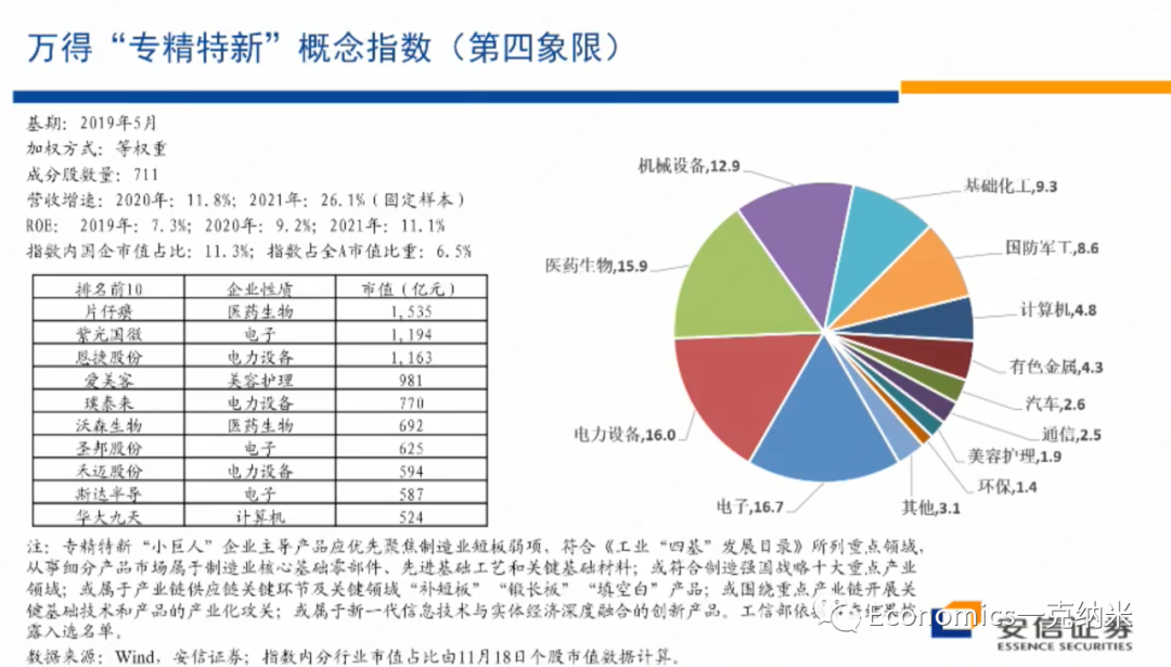 最后我们看一个专精特性,开一个专精特新,是因为我们一开始提到的,在涉及到安全关切的众多的小的细分领域,由于技术上的不确定性,以及这些领域足够的细分,完全由国有企业去主导这些领域,我个人认为可能在操作上不一定那么现实,国有企业也许就是起到主要的骨骼架构的作用,在大量的细分行业里边的龙头,可能主要还有民营企业来主导,那么围绕专精特新的这个板块的话,我们也来看一看它的一个表现和市场的看法。