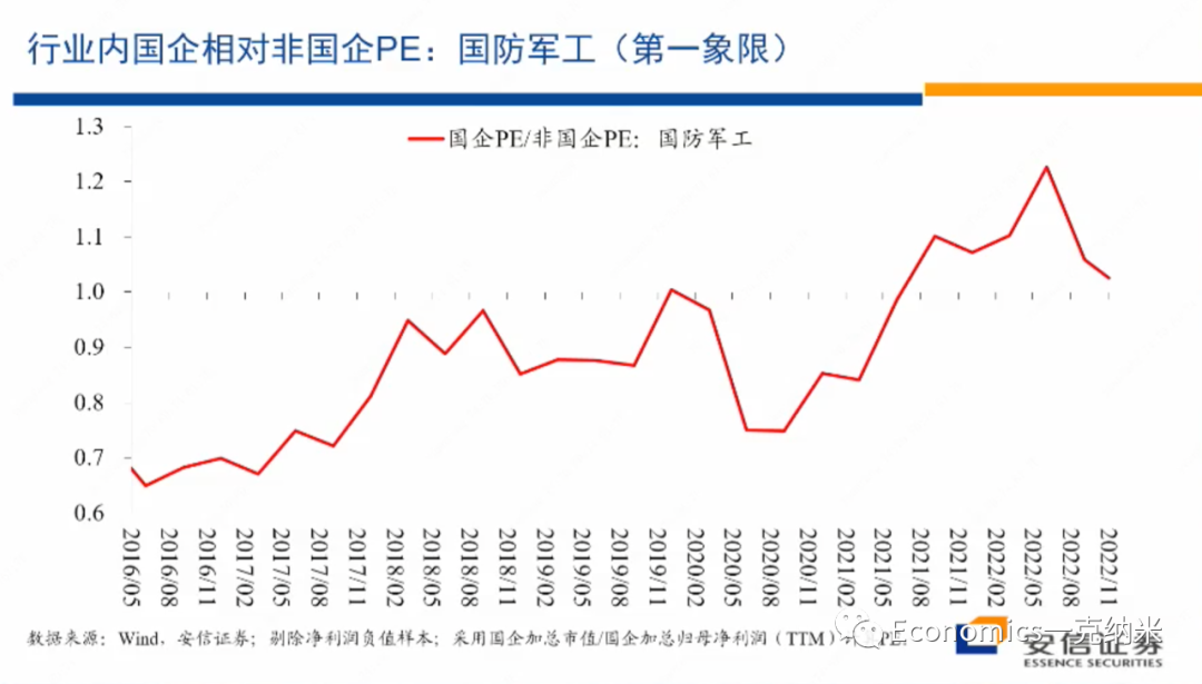 我们在这里的话也来看一看,就对于国防军工而言的话,它们的估值在行业内相对非国有企业的情况,那么结论也是类似的,跟我们刚才的阐述和预期比较接近。