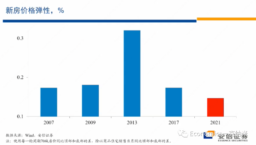 我们还可以从另外一个角度的话来观察同样的数据,那么在这个数据上的话,我们计算的是房屋的价格弹性,新房的价格弹性。什么叫新房的价格弹性?我们知道在过去十四五年的时间里边,房地产市场经历了好几轮周期,经历了五轮周期。我们计算和比较了梅龙的房地产的下降过程,我们计算和比较了每一轮的房地产市场的下降过程,所谓的价格弹性是这样来计算的。