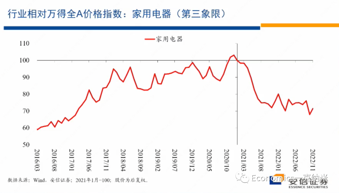 那么接下来的话我们进入第三象限,第三象限的话是家用电器,实际上可以放入第三象限的行业还很多,但是这个需要逐个行业去研究。我们的话就先拿了家用电器,因为家用电器我们认为比较典型,它不涉及安全关切行业有没有什么增长。