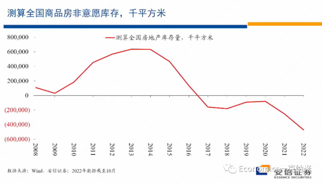 那么从这一估计结果来看,毫无疑问在13、14年前后,房地产行业曾经积累了大量的超额的存货,但是在2018年以后,这一存货水平基本上就已经下降到完全正常的水平。从这一估计来看,2021年和2022年房地产行业所持有的非意愿的存货放在历史上来看都处在异常低的水平,它的非意愿存货放在历史上来看,都处在非常低的水平。