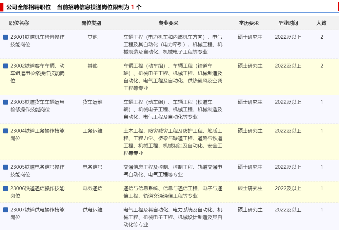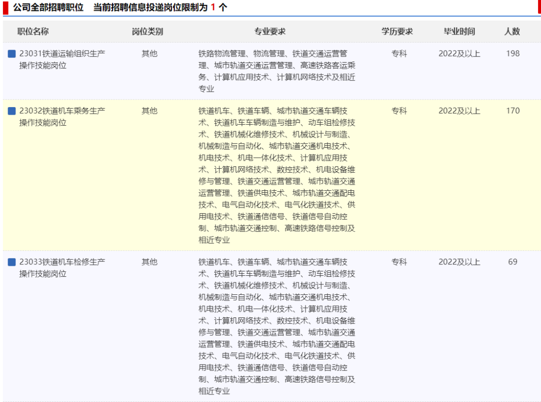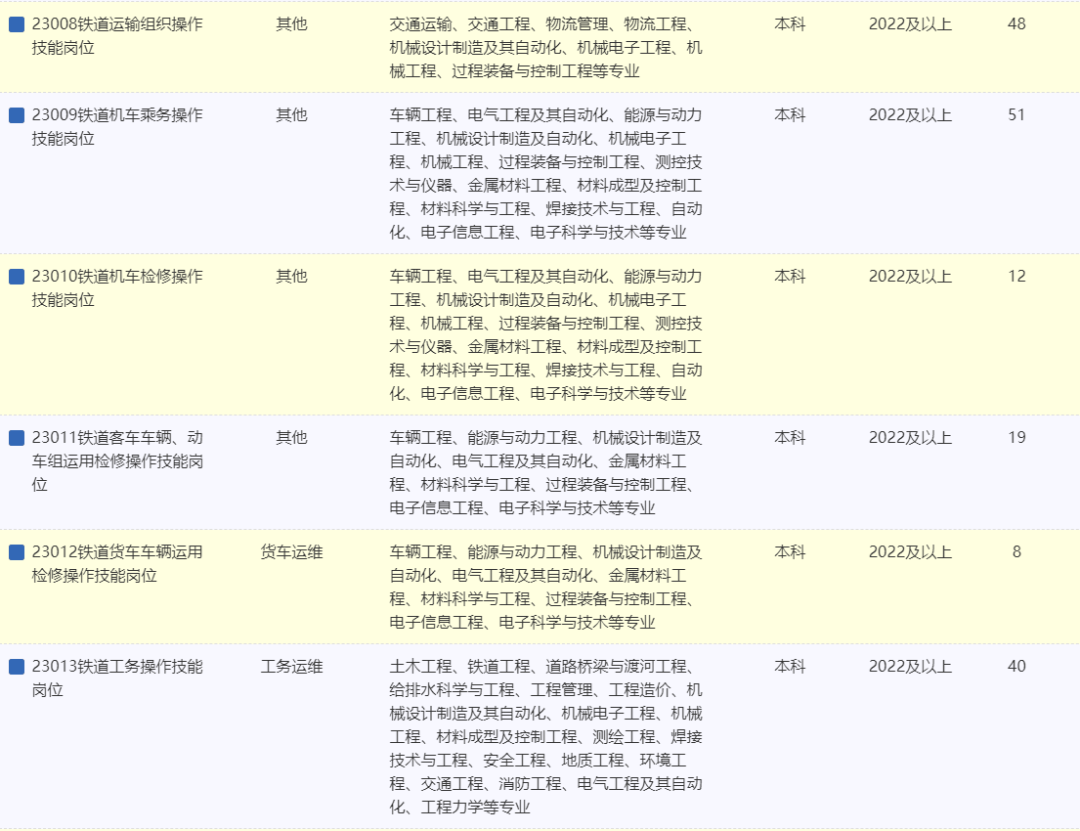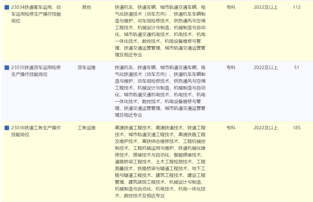 (二)符合招聘岗位要求的专业条件,列入国家招生计划,2023年和2022年毕业的全日制普通高等院校大专 学历毕业生。在校期间所学专业为铁路方向或所学主要课程中包含铁路专业课程。