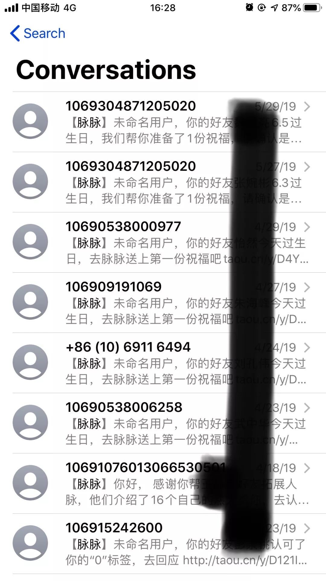 这样的消息,总共有 8 屏,每屏有 8 条,总共 64 条,注册前收到 9 条,注册后 55 条,最初时间是 2016.7.12,相当于每月被脉脉问候 2 次。