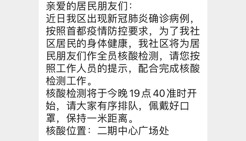 以为一切顺利,没成想晚上 7 点得到通知,7:40 小区要求全员核酸检测,没有疫情也不在中高风险,为什么要全员核酸。