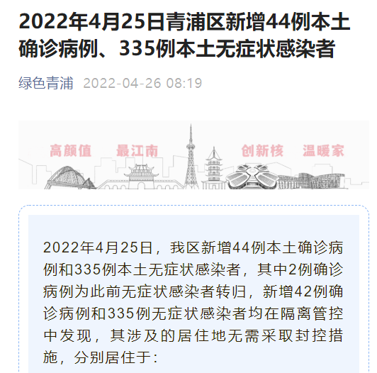 据青浦区官微“绿色青浦”消息,4月25日,青浦区新增44例本土确诊病例和335例本土无症状感染者,其中2例确诊病例为此前无症状感染者转归,新增42例确诊病例和335例无症状感染者均在隔离管控中发现,其涉及的居住地无需采取封控措施。
