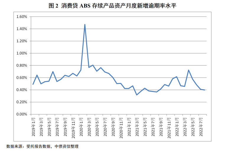 消费贷ABS产品表现受疫情影响波动最为明显,目前产品的资产风险指标已有所回落。一方面,以2020年上半年疫情高峰期间存续产品数据为例,2月新增逾期率均值达到全年峰值1.47%,环比上涨103%,5月新增违约率均值达到全年峰值0.28%,较疫情前上涨125%,相较于其他产品,消费贷ABS入池资产逾期率和违约率的均值和整体涨幅均最高。另一方面,根据消费贷ABS最新表现数据,2022年8月存续产品入池资产的新增逾期率均值为0.40%,新增违约率均值为0.17%,资产风险指标已较疫情高峰期间有所回落。