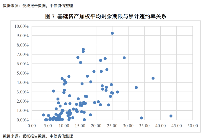 基础资产累计违约率与加权平均利率大体上存在正相关关系。统计显示,基础资产利率区间在0-6%对应的累计违约率均值最低(0.31%),利率区间在18%-24%对应的累计违约率均值最高(3.52%),随着基础资产加权平均利率区间不断提高,违约率水平呈上升趋势。