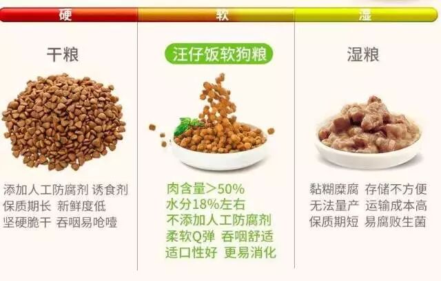 而我们的产品是介于两者之间的软狗粮,克服两者缺点,综合了两者的优势。干狗粮的含水量超过10%的时候,就会发霉变质,我们软狗粮用独家锁水工艺突破了这一点,我们的含水量能做到20%以上