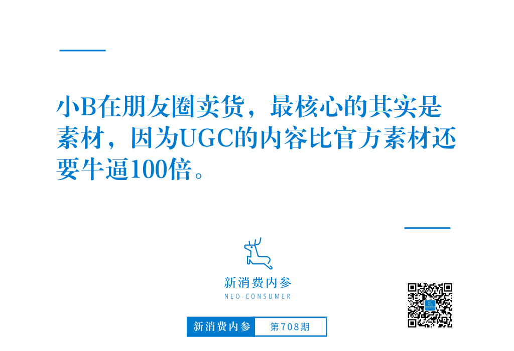 而小B在朋友圈卖货,最核心的其实是素材,因为UGC的内容比官方素材还要牛逼100倍。一般来说,官方素材都是非个性化的,并不适合匹配给朋友圈人群。另外还有一个更关键的因素,这些90后妈妈拍素材的能力远超于你预期的效果。现在几乎所有的年轻妈妈都能掌握精修图片的技能,而且图片风格很接地气,传播性特别强。另外,这些图片都是公用的内容,都是由KOL主动贡献出来的。贡献内容的KOL一般分布在两种社群;一种是卖货社群,在这种渠道KOL可以直接分销产品。另一种是UGC社群,在这种渠道的KOL并不太在意卖货赚钱,而重点在社群里面赚人气。等到挣够人气了,KOL可以自己将资源拷到自己微信上,比如说去加五千个妈妈,然后再放一遍产品信息卖自己的货。![]()