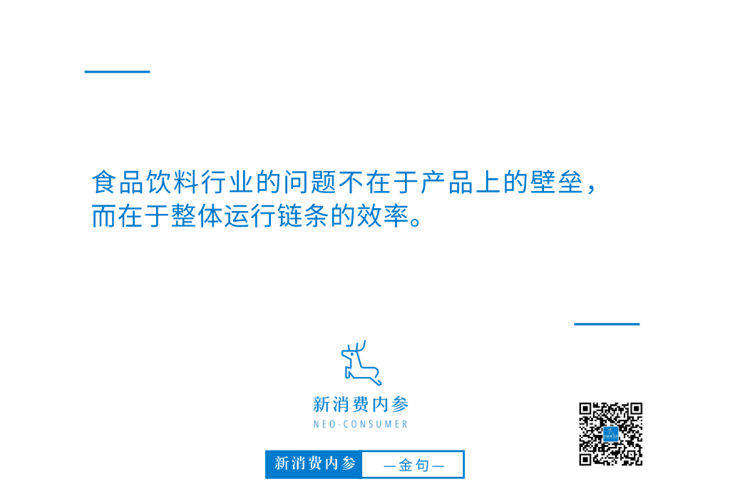 所以,食品饮料行业的问题不在于产品上的壁垒,而在于整体运行链条的效率——从产品本身的的设计开始,到推出产品,到前端的运营,再到客户端以及整个供应链的运行效率才是最重要的。企业最后会回归到一个生意,而不是一个创意。