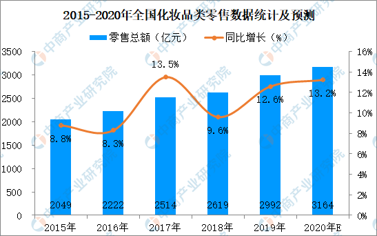 据国家统计局数据显示,2019年我国化妆品类零售额接近3000亿元。根据中商产业研究院数据,2019年我国化妆品行业整体市场容量达到4777.20亿元,2014-2019年年均复合增长率9.9%,预计2024年我国化妆品行业市场容量将达8282亿元。