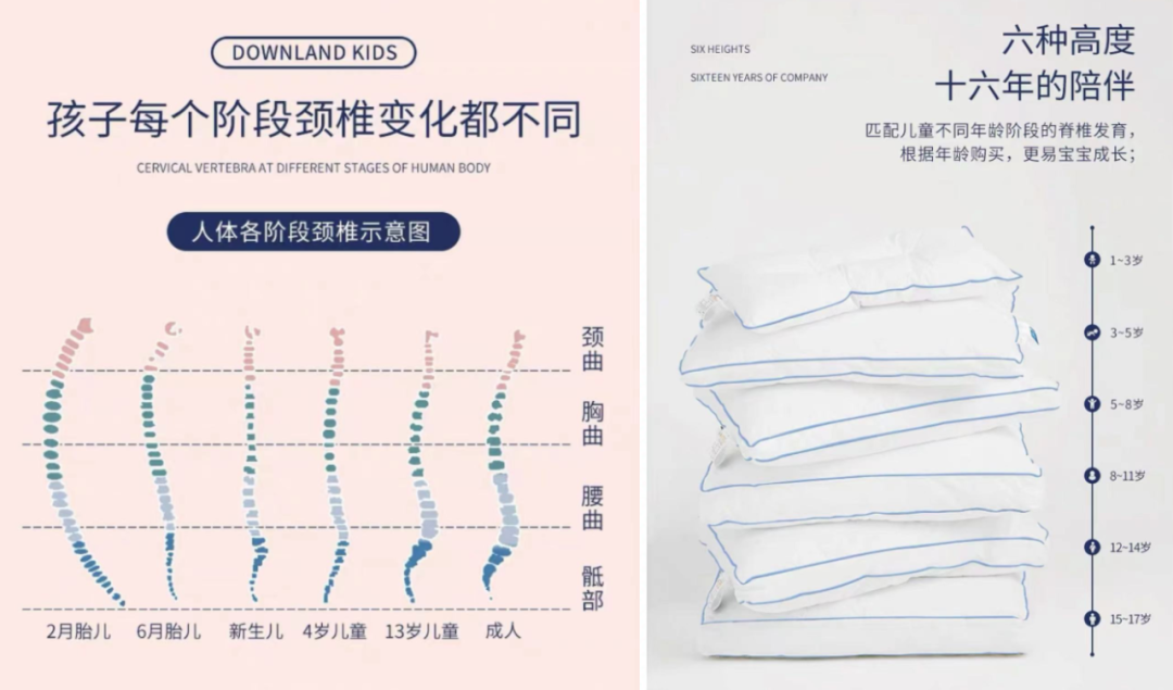 在产品的功能性设计上,除了科技的加持,眠白科技还会深究产品细节,致力于全面提升睡眠体验。比如眠白科技旗下的Downlandkids儿童枕头则为根据人体各阶段的脊椎变化,由英国骨科专家,专门为1-17岁的亚洲儿童专门设计护脊成长枕。