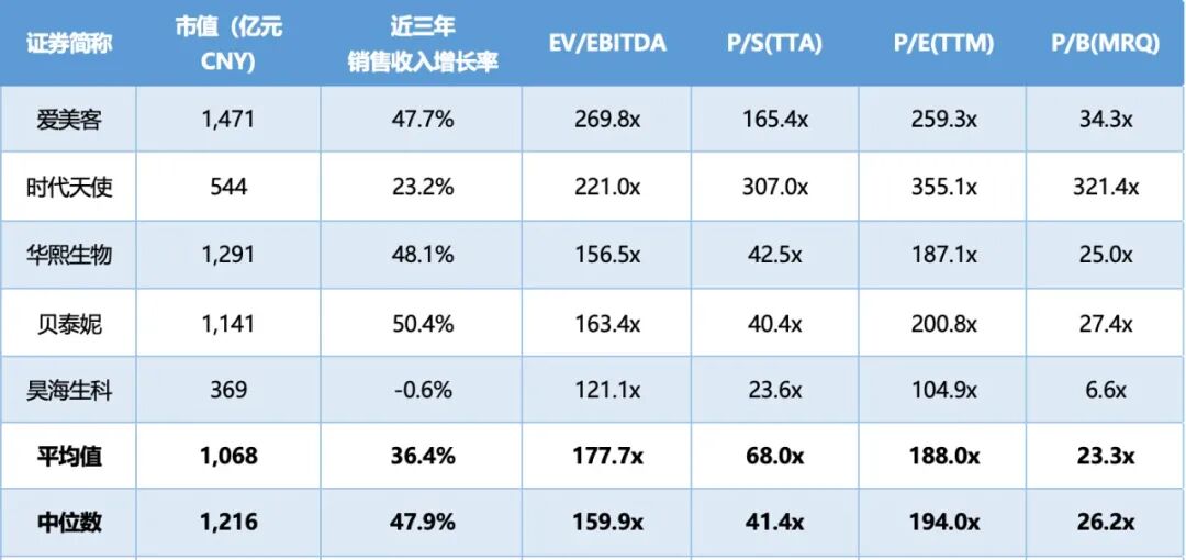 从公开数据我们可以发现,在医美概念股中,爱美客自创业板上市后股价一路走高,市值从上市最初的300多亿元一路攀升,在今年2月1日公司总市值首度突破1000亿大关,截至今年6月1日的数据统计,爱美客的市值超过1470亿元,股价营收比高达165.4倍;而华熙生物2019年年收入超过18亿元,净利润5.86亿元,截止今年6月1日的数据,华熙生物市值超过1290亿元,股价营收比为42.5倍;时代天使2020年年收入为8.17亿元,净利润相较于2019年呈现翻倍成长。