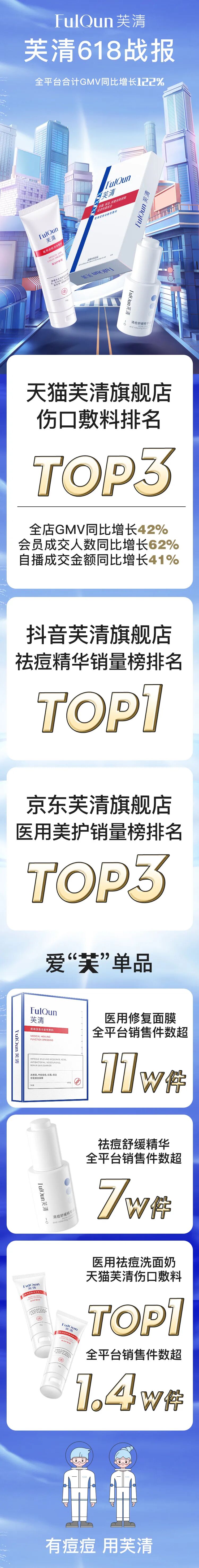在刚刚过去的2022年“618”,数据显示,新锐功效护肤品牌芙清全平台销售额同比去年增长122%,其中天猫旗舰店同比增长40%,品牌位居天猫伤口敷料类目TOP3。其中,品牌爆品芙清清痘舒缓精华液销量位居抖音平台祛痘精华液爆款榜TOP1,累计热销5万件。
