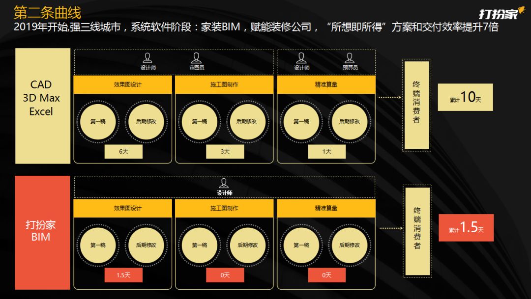 对于弱三线城市,招到优秀的设计人才是一个难题,而在S2B2C模式中,用户可以通过BIM系统直接在线进行设计,对接高端设计人员,并由打扮家统一监督管理,彻底取代传统设计部的职能。