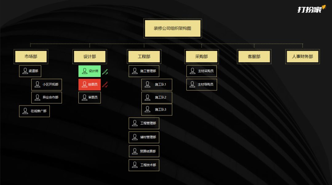 这个阶段,装修公司的绘图员、审图员、中低端设计师、辅材员、预算员、工程技术员、市场人员、采购人员大幅度减少,市场费用、店面面积停止增长并开始降低;高端设计师,施工管理人员和工程监理被加强。