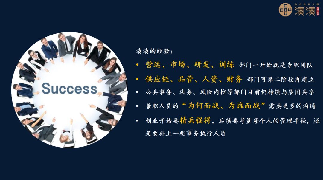 现在,湊湊运营将近两年的时间,针对这些问题,我们的经验是如果想要让大家从工作变成追求成功,那么前面几个特别重要的部门,比如说营运、市场、研发、训练,包括商业地产的开发,从一开始就应该是专职团队,因为这些部门的工作成果跟消费者有直接的关联,对整个业务模式有比较大的影响。