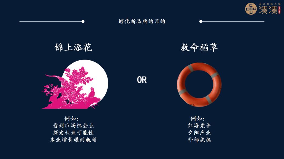 还有一种情况是扮演救命稻草的角色。比如说最近有些做P2P理财的朋友,因为外部环境出现了一些问题,必须要紧急的帮集团找到一个新出口,对他们来说孵化新品牌,可能就是集团的一个救命稻草。