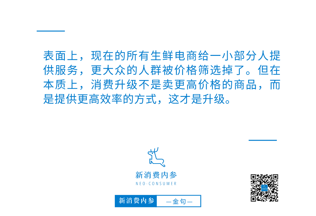 生鲜电商为一部分人群服务在本质上是差异化经营。我与众不同的定位就是要到家,就是要更好的服务。表面上,现在的所有生鲜电商给一小部分人提供服务,更大众的人群被价格筛选掉了。但在本质上,消费升级不是卖更高价格的商品,而是提供更高效率的方式,这才是升级。![]()