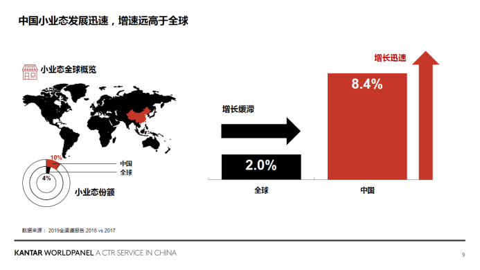 凯度消费者指数研究的数据显示, 中国最大的快速消费品零售商大润发、永辉、沃尔玛、华润万家和家乐福这五家, 占到整个市场购物者总触及数的1/3,因此对于任何品牌来说仍是非常重要的合作伙伴。凯度消费者指数有一个专门的指标,即购物者触及数(SRP), 来测算零售商的影响力,通过进店消费的消费者人数乘以其购买的次数,数据显示这五家零售商的购买人次是远远超过其他零售商的。当然这五家实体零售商在过去一年的市场表现都面临很大的竞争压力,但是对于品牌生意而言,这五家零售商仍然是至关重要的零售伙伴。同时,这些以大型卖场为主要模式的零售商也在过去两年进行了深度的转型,包括数字化,推出紧凑型大卖场,重新专注快消和生鲜以及通过各种新的技术手段/客户数据,来提升顾客购物体验。从实际市场反馈的数据来看,这些零售商的市场表现也在恢复中。以大润发为例,2019年上半年它在实体渠道的市场份额是3.8%,到下半年恢复到4.1%,高鑫零售最新的财报也显示大润发在2019年止跌企稳。苏宁改造下的家乐福和沃尔玛的表现也有不少可圈可点之处。综合来说,经历了“痛苦”改革的这些 Big Box零售商的市场表现在回暖,因此品牌需要关注到这样的变化,加入他们的变革进行时,创造共赢,一起实现业绩的增长。第二,O2O进入2.0时代。O2O在中国几年前应运而生,目前逐渐成为不同规模的零售企业的标配。凯度咨询的研究显示在中国O2O有三种模式,分别是自营模式、平台模式、新零售模式。目前,平台模式占O2O市场最大的份额,包括大家非常熟悉的美团、饿了么、京东到家、淘鲜达等平台。从模式的角度来看,这三种模式各有各的优势。同一个零售商会同时使用不同的模式,扩大消费者的覆盖。我们认为这次疫情以后平台模式和新零售模式会有更快的发展,因为这次全民‘宅’家等于给O2O模式提供一场免费的市场教育。值得一提的是,从自营模式向平台模式发展的多点,也得到更多本土零售商的使用,成为一个非常独特的模式。当30-60分钟/3公里送货上门逐渐成为标配以后,零售企业将面临O2O进入2.0时代的挑战。2.0的时代,服务创新或者更好数字化体验将会成为O2O平台的制胜模式。是否能够实现预约上门送货,是否有互动性/体验性更好的移动APP,以及背后更强大的供应链支持将会是这个新的时代O2O应该形成的竞争优势。第三,生鲜社区电商的崛起。中国的社区生鲜零售,在过去十年经历了过山车的发展,一直是资本市场的热门标的。从最早的垂直生鲜电商,到阿里、京东、苏宁杀入生鲜市场到现在的多模式多业态的混战状态,生鲜零售的盈利模式也一直是从业者无法回避的话题。中国的消费者并不会只在一个生鲜零售渠道去购买生鲜产品,目前是5.4个,这也意味着对于任何零售商和生鲜零售模式来说市场机会都足够大而集中度非常低。O2O平台以及那些新零售模式企业的入局将更彻底改变生鲜的购买模式和服务模式。对于生鲜零售来说,市场有巨大的发展空间。这次疫情期间,大家可以看到生鲜零售平台的爆发性增长,不管是自营的还是平台型的。很多的买菜APP都在小区的门口设立了专门放快递的大棚,上面有明显的品牌标识,是一个非常有效的户外广告,知名度得到了飞快的提升,为品牌在疫情后的发展打下很好的基础。对于品牌主来说,怎样利用生鲜零售的发展,让自己的产品进入消费者的生鲜购物篮,是一个非常值得探讨的话题。生鲜是高频品类,如果品牌可以进入生鲜购物篮,将会是一个非常好的增长机会。这个机会既可以是针对用于烹饪佐餐的品牌,也可以是消费者在临时需要时可以随时在生鲜零售平台上买到的产品。第四,谈一下小业态。小业态在全球的份额不是特别高,但是在中国,有接近10% 的份额,而且增长速度远远快于大盘,显示了独有的生机和活力。在零售行业,大有大的玩法,小有小的做法。以前品牌不太重视小业态,一般较少建立直供的关系。但我们可以非常清楚地发现消费者在小业态购物的需求和大卖场大超市是完全不一样,因此在单品选择、包装、定价、促销等方面都需要有更多定制化的考虑。第五,线上线下的商业模式的融合和不同零售生态系统的适配。在中国围绕不同的电商体系有不同的生态系统。从发展的角度来看,中国零售市场也经历了从纯电商、到社区电商、到O2O模式、到B2B模式、再到DTC(直接面向消费者)模式的转变,而这些不同模式不仅并存,而且都有不错的发展。这几年谈的比较多的是DTC模式,依托内容获客,构建私域流量池到门店,构建商业闭环。在中国,对品牌的另外一个挑战是如果灵活适配各种不同的生态系统,实现增长。第六,户外市场催生新的渠道和新的消费机会。我个人非常看好户外市场,如果能把消费者的消费简单地分成两部分,一部分消费者在家消费,另外一部分是消费者在外消费。在外消费包括非常丰富的消费场景,比如办公室、休闲娱乐场所、公交站、便利店等等,对于食品饮料来说,户外销售几乎占了半壁江山。对于户外消费市场来说,餐饮渠道、便利店和传统的杂货店的重要性都比较高。对于食品饮料的品牌来说是非常重要的‘场’,此外户外消费场景也在孕育更多新的物种,比如自动售卖机或者在影院健身房的销售设施。疫情结束以后,户外市场将会迎来爆发性的消费反弹,因为憋了这