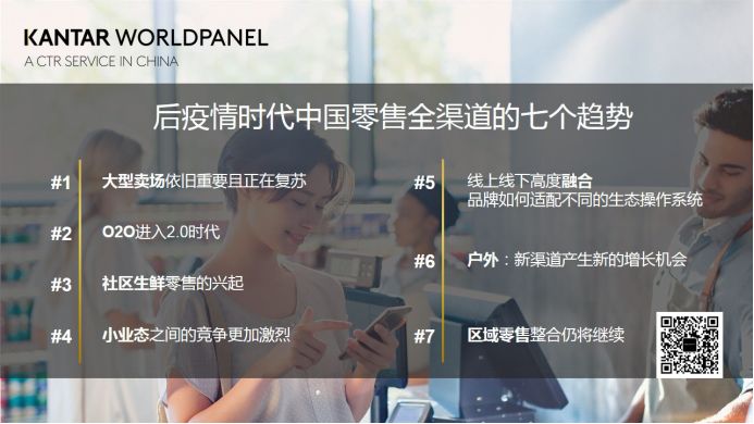 接下来,我想跟大家分享在后疫情时代中国零售全渠道的七个大趋势。这里有一些趋势在2019年已经非常明显,而这次的疫情会加速某一些趋势的发展,也会对另外一些趋势有不同程度的影响。第一个大趋势是大型卖场依旧重要且正在复苏;第二个大趋势是O2O进入生机勃勃的2.0时代;第三个大趋势是社区生鲜零售的兴起;第四个大趋势是小业态之间的竞争会越来越激烈,也需要有更加针对性的策略;第五个大趋势是线上线下更加高度的融合,品牌需要应对不同生态系统的适配;第六个大趋势就是户外市场所催生的新渠道和新的增长机会;第七个大趋势是区域零售继续的整合并购而带来的机会。![]()