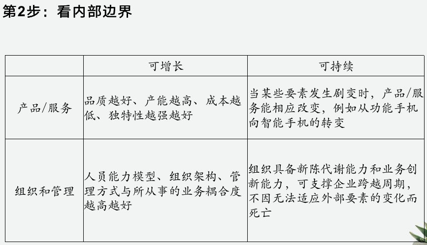 我们现在已经知道看一个公司可以分成哪三步了,那么什么样才算是“好”呢?我个人的标准是看两项:单项业务看是否可增长、公司总体看是否可持续。它的内外部边界是否可以向外拓展?市场上可能被赚到的钱,以后会不会增加?你自己的供给能力,今后会不会增加?一家公司在一个阶段赚钱不难,难的是一直赚钱。好公司应该是可持续生存的。持续生存主要关系到两件事:抗风险能力、业务的新陈代谢(所有业务都有生命周期,不可能一直存活,老业务衰退时要有新业务顶上)。![]()