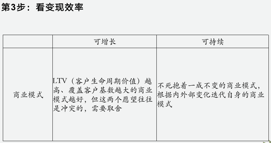 以上讲的是评估的原理,接下来才是真正能落地的评估方法,我们需要从5个具体的要素维度去进行评估。需求是所有商业活动的逻辑起点。它来自于人的生理和心理欲望:安全、温饱、社交、荣誉、支配、性、成就感、出行、快乐、信仰等。需求的基本元素是不变的,但需求的排列组合千变万化,“需求组合”是指导实践的最小单元。比如公共汽车满足了“出行+低价”,出租车满足了“出行+便利”,飞机满足了“出行+远途+快速”。公司选择去满足的需求组合越广泛、越持久、越刚性越好。目标客户是公司有可能覆盖的客户的集合。目标客户人数越多、可支配收入越多、支付意愿度越高越好。公司在面对外部时很喜欢夸大自己的目标客户,但是CEO对自己最好要诚实。举例来说,一家线下社区便利店的目标客户就是其周围1公里半径以内的居民,但它可能会说“我们的目标客户是中产家庭”。对于目标客户的定义方式是一门学问,你可以用“年龄、性别、地区、收入”这些客观维度去定义,也可以用“二次元、发烧友、文艺青年、极简主义”这些主观维度去定义。你对目标客户的定义方式,决定了目标客户的拓展边界。产品/服务是公司满足目标客户的需求组合的一个“解决方案”。一个需求组合可以对应多个产品/服务,公司不必将自己定义为一家产品公司,而应该将自己定义为一家“满足XX客户的XX需求”的公司。在外部环境变化的时候,公司提供的产品应该相应变化。技术对一家公司的意义往往发生在产品形态的层面,例如一家1800年的出行公司可能是提供马车的,而一家1900年的出行公司可能提供汽车,而2020年的出行公司可能提供的是电动车。公司的产品/服务品质越好、产能越高、成本越低、不可被模仿性越强越好。组织和管理是公司交付产品/服务的一种手段。组织和管理核心的功能是分工和分配,不管是KPI还是OKR,不管是金字塔还是扁平化,只要能把业务做好的就是好管理。组织也不是民主制,它不是一种信仰,业务发生变化组织和管理也要相应进行调整。好的组织和管理,就是要让人才越优秀、优秀人才越多、能实现目标统一、人员有充分的积极性、分工合理高效、组织成员能新陈代谢。商业模式是发生在公司与客户之间的、商品与货币进行互换的流程。我能想到的常见商业模式包括:批发、零售、分期付款、交易佣金、租赁、按用量计费、付费会员、C端免费+B端广告、预充值、保险、赌博等。商业模式设计的核心是8个字:高价低价、高频低频。高价高频大多违法,低价低频没法生存,绝大部分商业模式都属于高价低频和低价高频。评价商业不是不是说它价格越高、频次越高就越好,而是要看它能不能实现LTV的最优化。LTV就是客户生命周期价值,LTV=价格*客户全生命周期消费次数。公司需要寻找价格和频次之间的平衡点,从而创造最高的LTV。