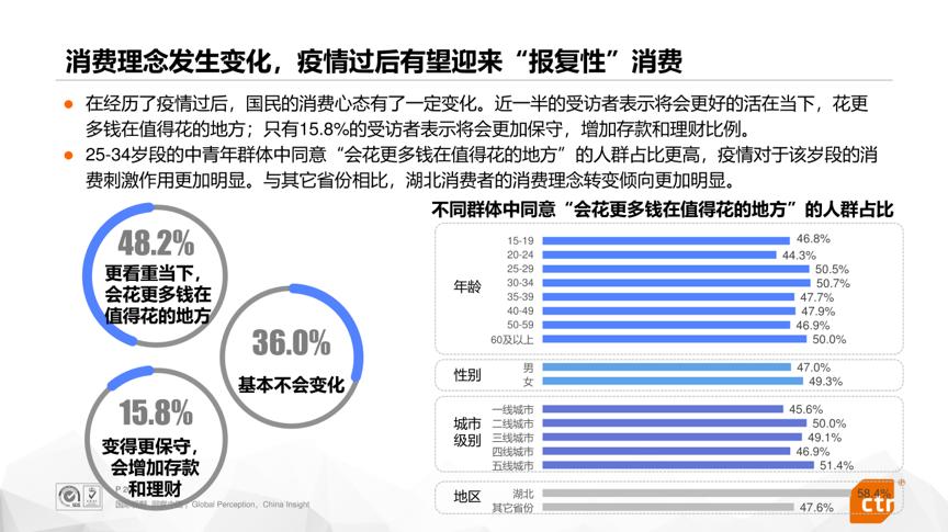 首先,疫情对于大众消费理念的影响体现为报复性消费。数据显示,近半数的消费者表示未来将会花更多的钱,也就是说,很多在疫情之前不舍得花的钱,很可能在疫情之后会去花。